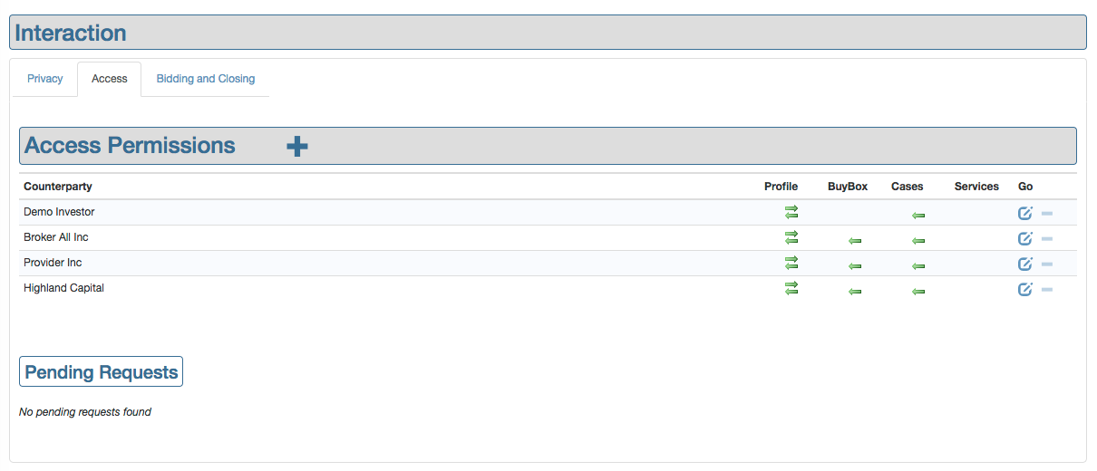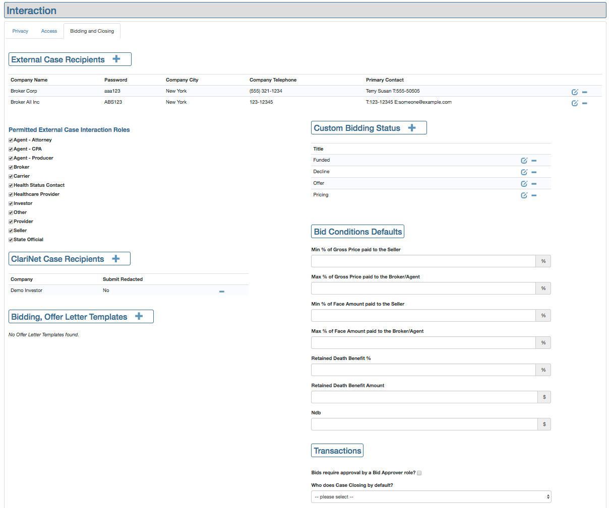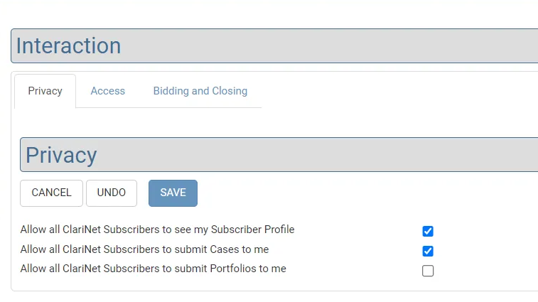 This page controls access for other ClariNet LS clients to you and your information. It also allows you to specify the ClariNet LS clients and CRM entities to which you wish to send Cases through ClariNet LS’s Bid Management function.