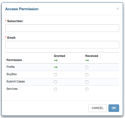 Check the boxes under the Granted column for the Permissions you wish to grant and check the boxes under the Received column for the Permissions you wish to receive from the other Subscriber.